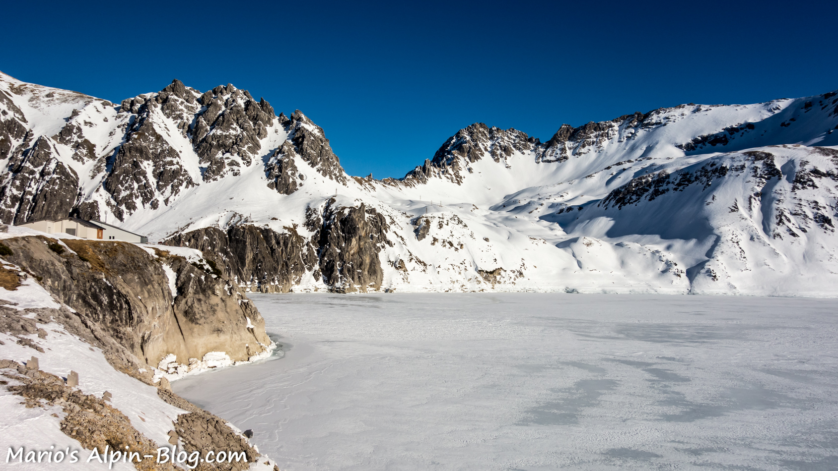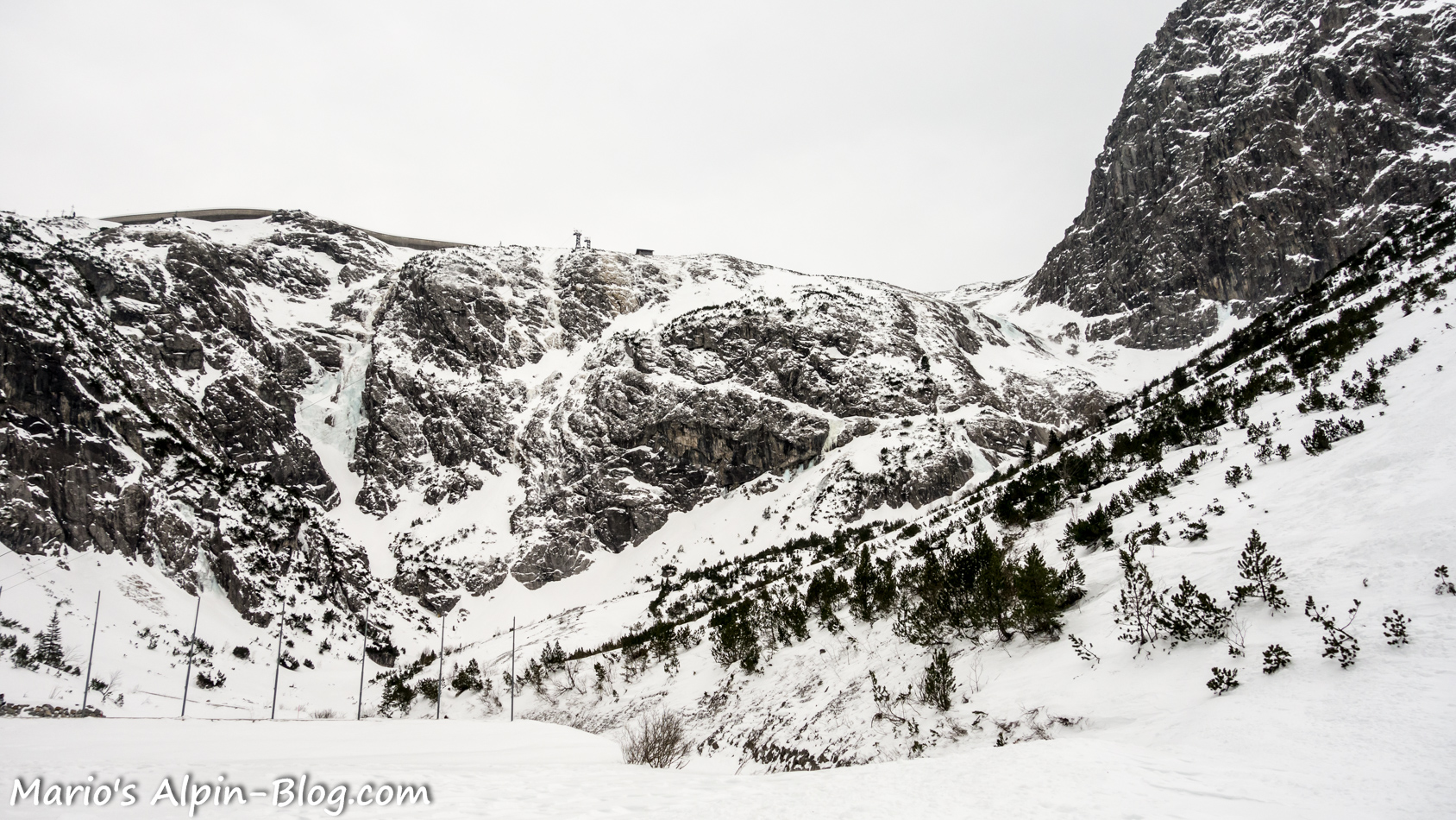 Nachdem der Fönsturm am nächsten Morgen nochmals einen Gang höher schaltet und der Himmel nicht berauschend einsieht entschließen wir uns zur Abfahrt. Der böse Tritt wurde über Nacht wirklich böse und es muss nun etwas mehr (10 m) abgeklettert werden. Kein anderes Durchkommen möglich, weil alles verblasen. Trittsicherheit und Gefühl unbedingt notwendig, da das Gelände wasser-vereist ist. Hat man den Tritt hinter sich gebracht ist die weitere Abfahrt ein Kinderspiel und über die Rodelbahn geht’s zurück zum Auto.