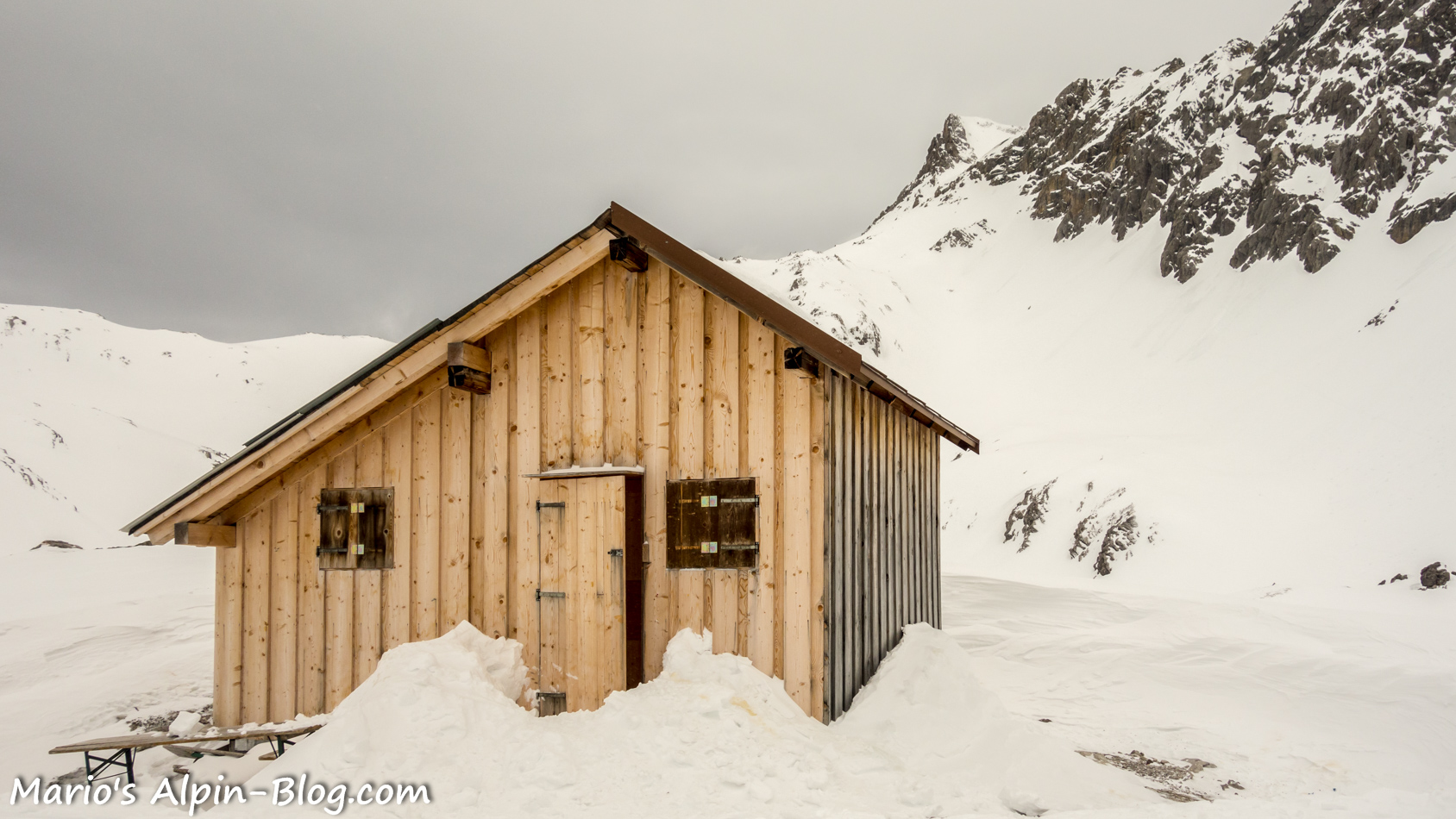 Im letzten Dämmerungslicht schwinge ich zur Totalalphütte ab. Die Bedingungen sind im oberen Teil hart, ab der Mitte bis zur Hütte gut. Der Schnee ist meinst bockhart. Bei der Hütte herrscht meinerseits etwas Verwirrung, denn das Stiegenhaus (Fenster Richtung Schesaplana) ist hell erleuchtet. Also suche ich den vermeintlichen Eingang zum Winterraum – den ich jedoch nicht finde. Des Rätsels Lösung liegt in einem c.a 100 m entfernten kleinen Holzhäuschen, das der wahre Winterraum ist. Nachdem hier bereits Leute sind werfe ich sämtliche Wegoptionen über Bord und quartiere mich ebenfalls im geräumigen Lager ein. Der Raum ist tiptop ausgestattet und sehr neu. Ofen gibt es zwar keinen, dafür elektrischen Strom, der ein Heizaggregat sowie 2 Herdplatten wärmt. Daneben hängt ein Münzapparat, der nur 1-Euro-Münzen nimmt und dafür jeweils 30min Strom liefert. Deluxe!! Ach ja, und es gibt österreichisches Handynetz inkl. WWW Empfang.