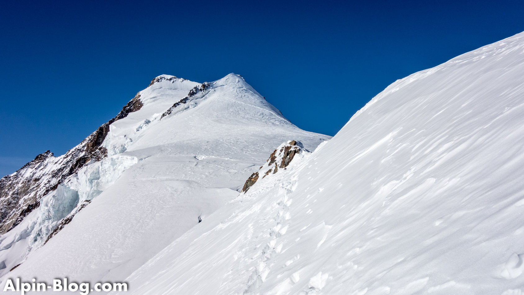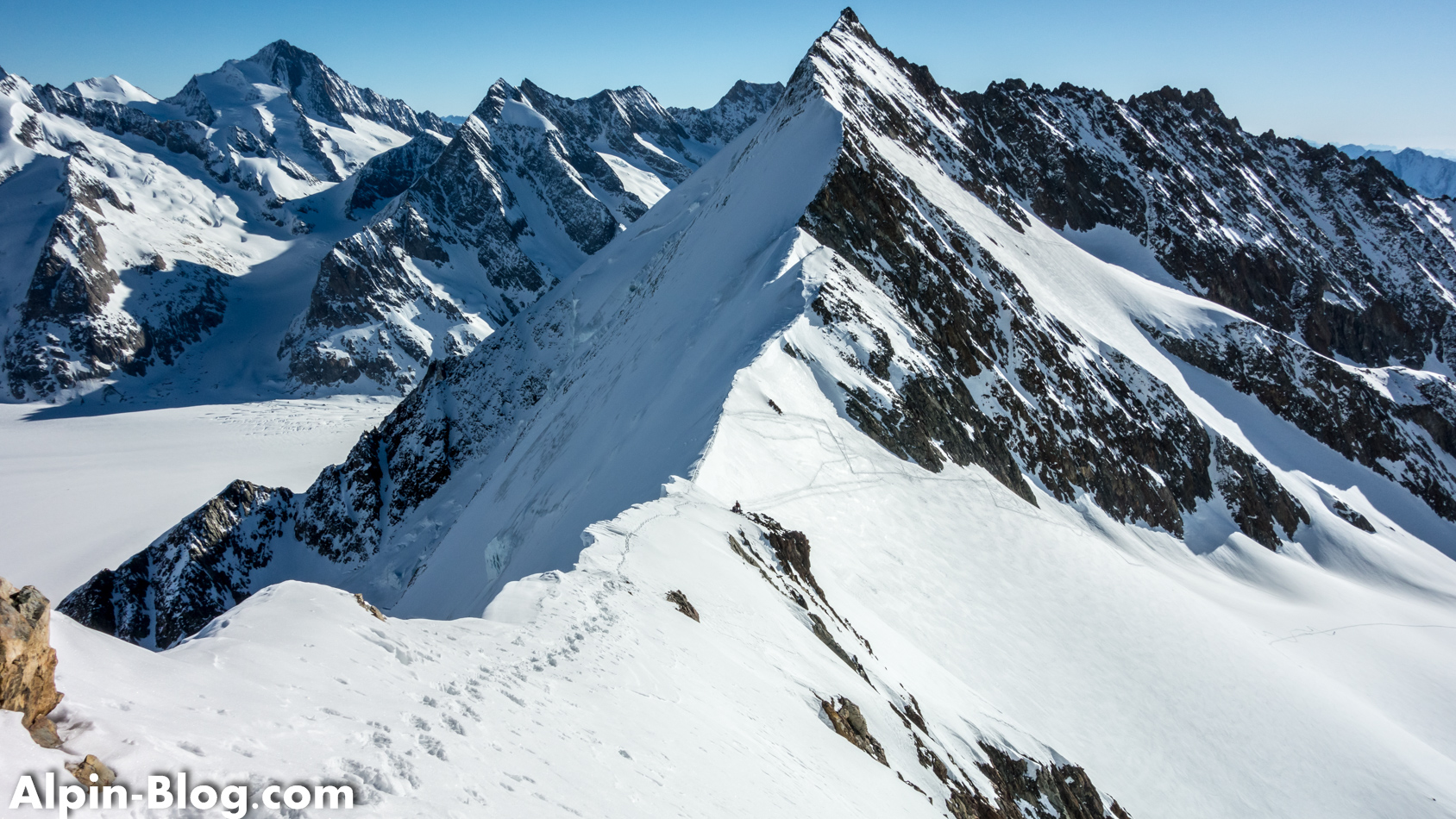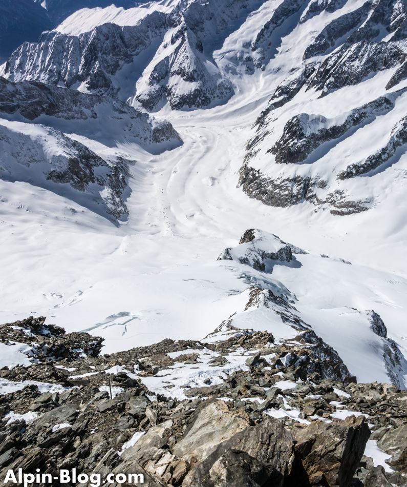 Am nächsten Tag starten wir gegen 07:00 Uhr nach einer mittelprächtigen Nacht bei verhältnismäßig warmen Temperaturen. Normalerweise ist der Aufstieg zum Aletschhorn als eiskalte Tour bekannt. Heute merken wir nichts davon. Die ersten Höhenmeter laufen wir am Schnürchen bis es kurz unterhalb des Aletschjoch steil zur Sache geht. Der brettharte Hang verzeiht keine Fehler und wir erreichen erleichtert das Joch. Link und rechts pfeift es einige Hundert Meter in die Tiefe und vor uns läuft eine – man glaubt es kaum – Skispur über den Grat. Wax! Nun gut, wir entscheiden uns ohne Diskussion für Steigeisen und schnallen die Ski auf den Rucksack. Die ersten 20m ist etwas Balancieren angesagt – danach geht der horizontale Schneegrat in eine Flanke über, wo wir uns selbstbewusster entlang bewegen.