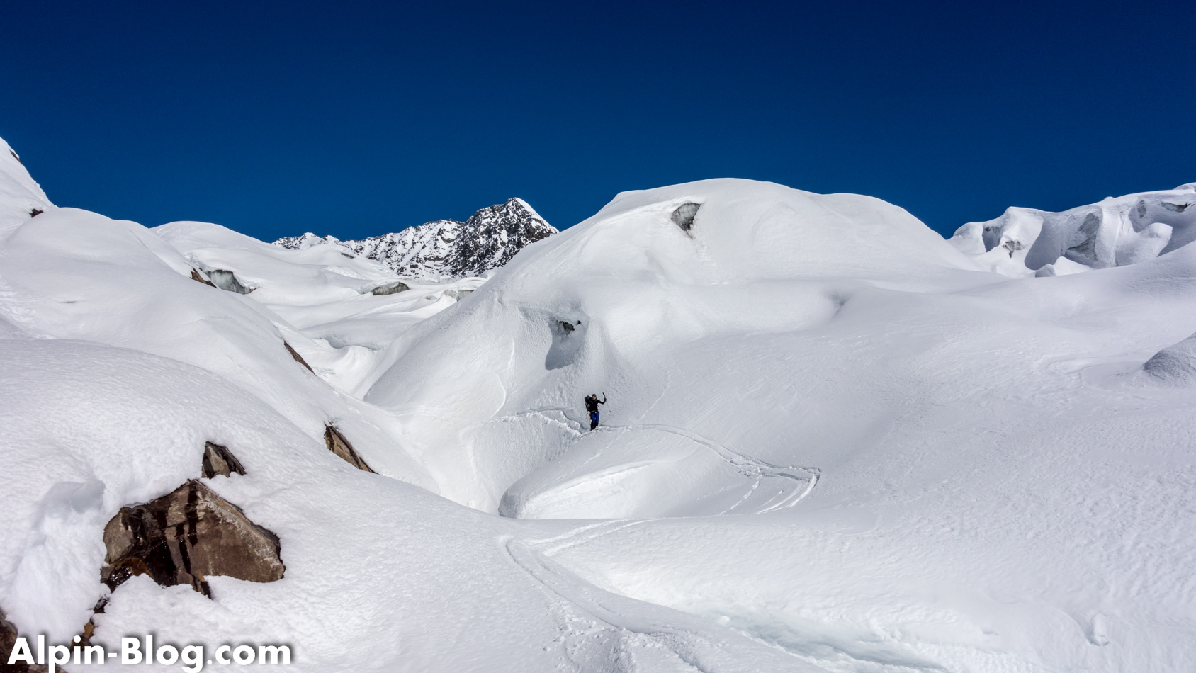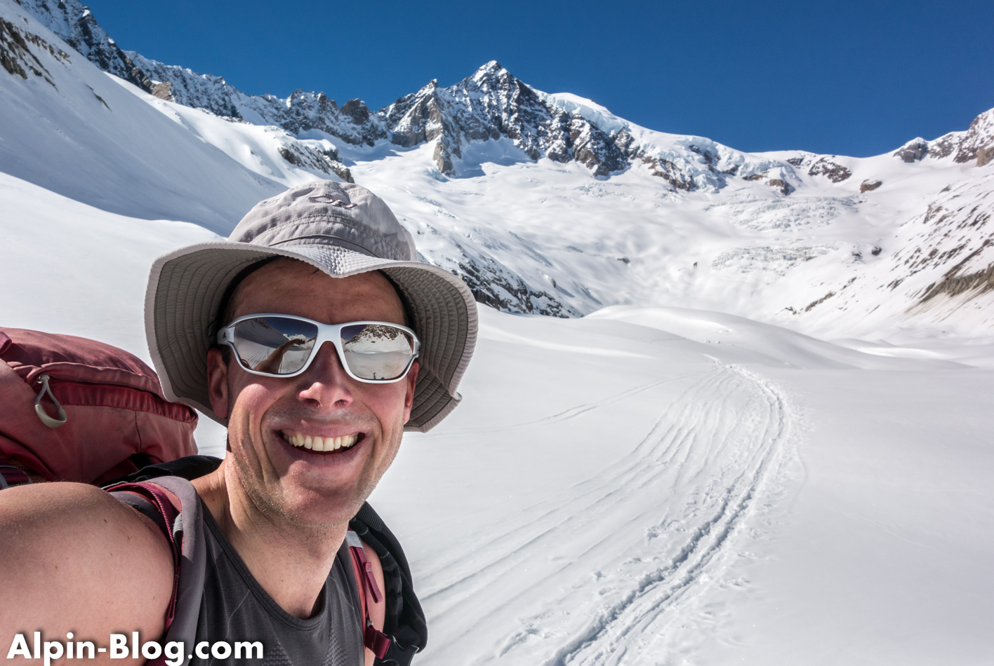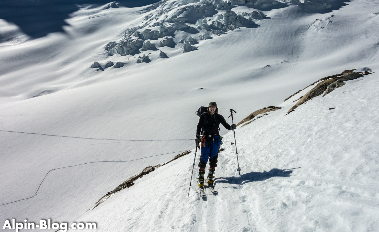 Am nächsten Tag starten wir gegen 07:00 Uhr nach einer mittelprächtigen Nacht bei verhältnismäßig warmen Temperaturen. Normalerweise ist der Aufstieg zum Aletschhorn als eiskalte Tour bekannt. Heute merken wir nichts davon. Die ersten Höhenmeter laufen wir am Schnürchen bis es kurz unterhalb des Aletschjoch steil zur Sache geht. Der brettharte Hang verzeiht keine Fehler und wir erreichen erleichtert das Joch. Link und rechts pfeift es einige Hundert Meter in die Tiefe und vor uns läuft eine – man glaubt es kaum – Skispur über den Grat. Wax! Nun gut, wir entscheiden uns ohne Diskussion für Steigeisen und schnallen die Ski auf den Rucksack. Die ersten 20m ist etwas Balancieren angesagt – danach geht der horizontale Schneegrat in eine Flanke über, wo wir uns selbstbewusster entlang bewegen.