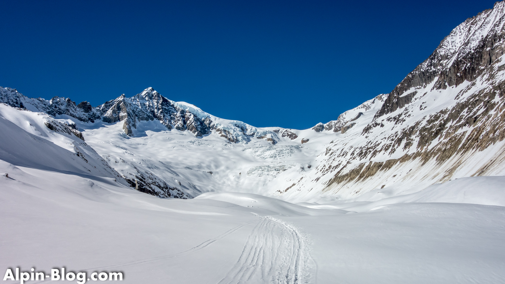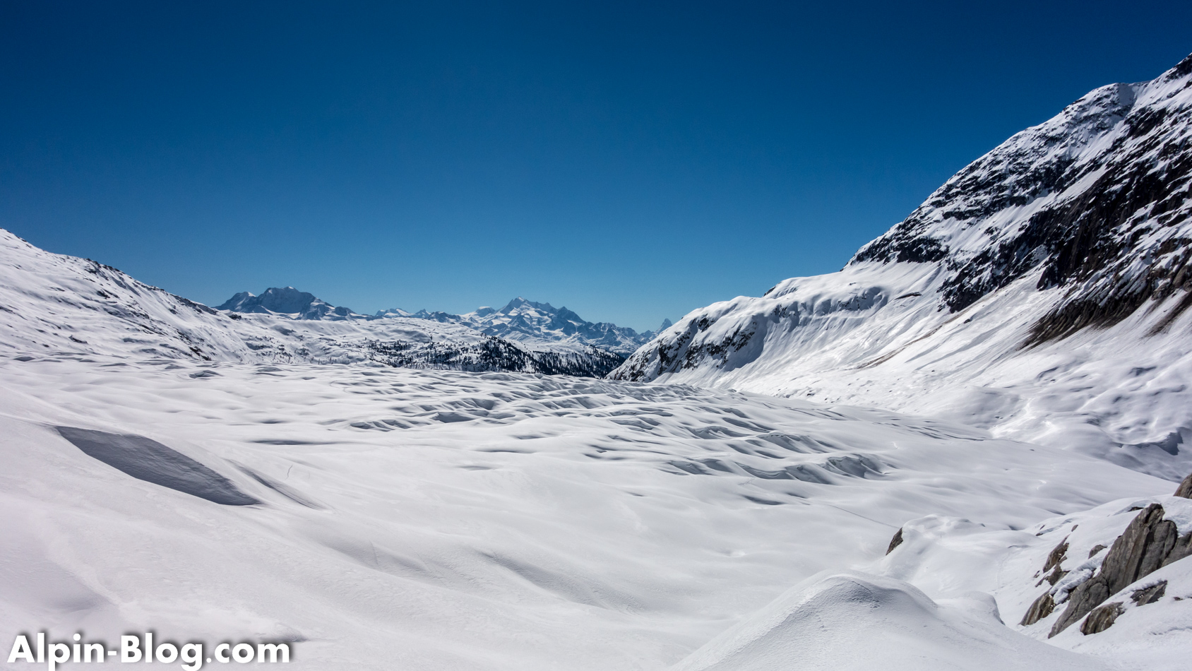 Wir fahren zum Tälligrat ab, wo wir die kommerzielle Skiarena verlassen und in die weiße Wildnis eintauchen. Den Aletschgletscher queren wir direkt auf Höhe der Seen direkt nach Westen und umgehen somit die unangenehme Spaltenzone, die sich weiter südlich befindet. Der Gletscher ist unerwartet gut eingeschneit, allerdings brennt die Sonne unbarmherzig auf uns. Wir halten uns immerzu westlich und erreichen schnell den Mittelaletschgletscher – quasi einen Geländeeinschnitt, in sich irgendwo noch ein Gletscherrest findet. Im Winter ist das nie so ganz eindeutig auszumachen…