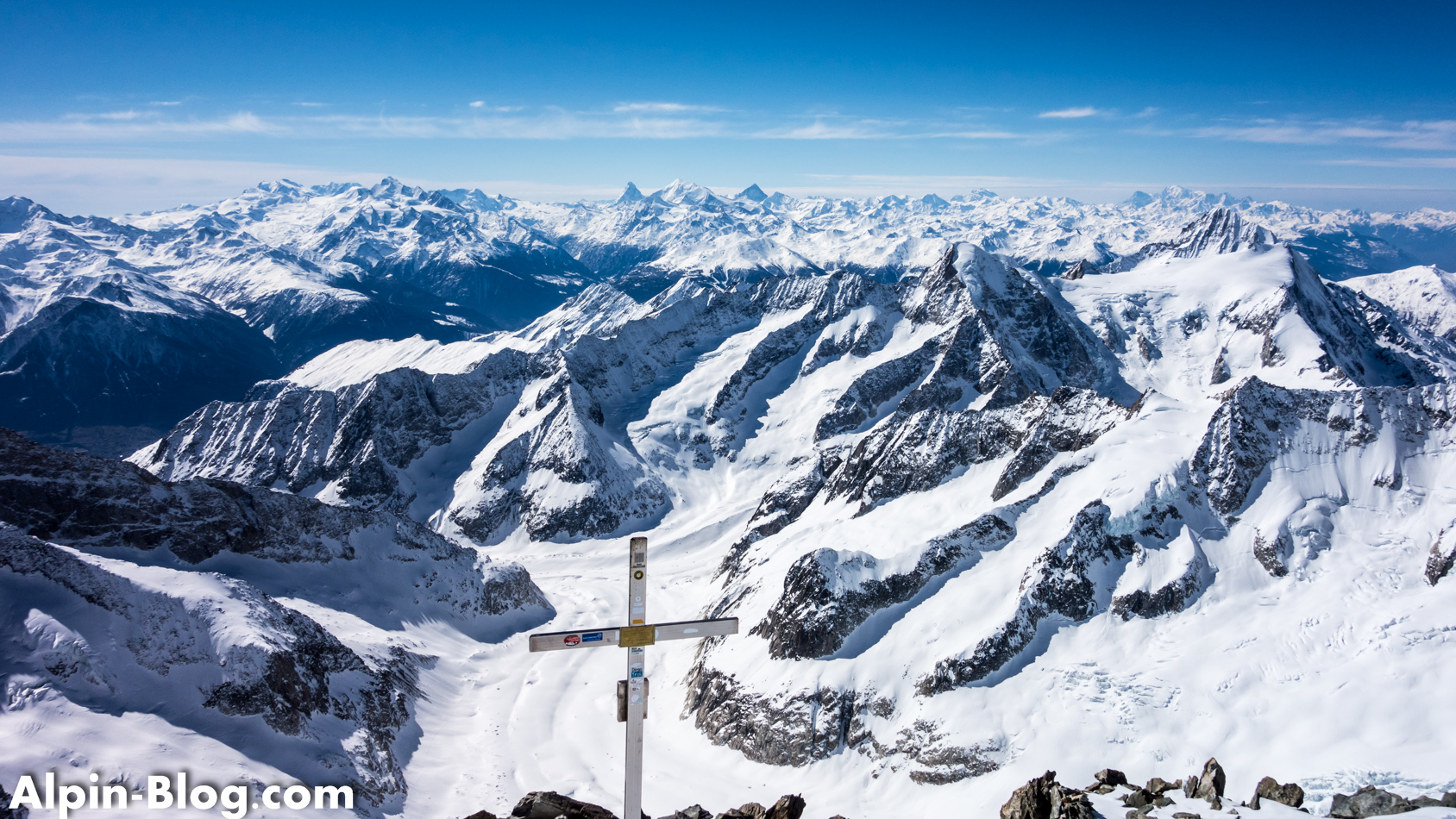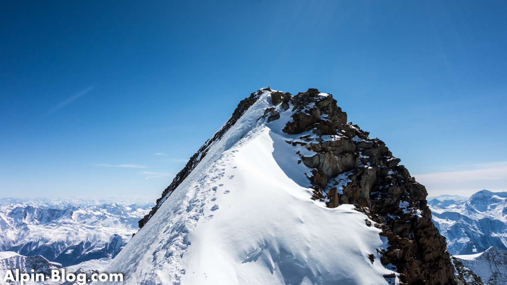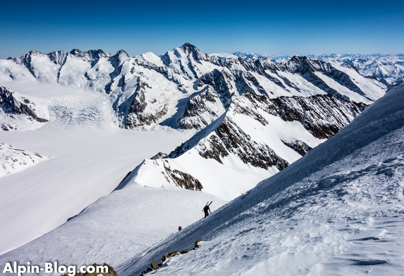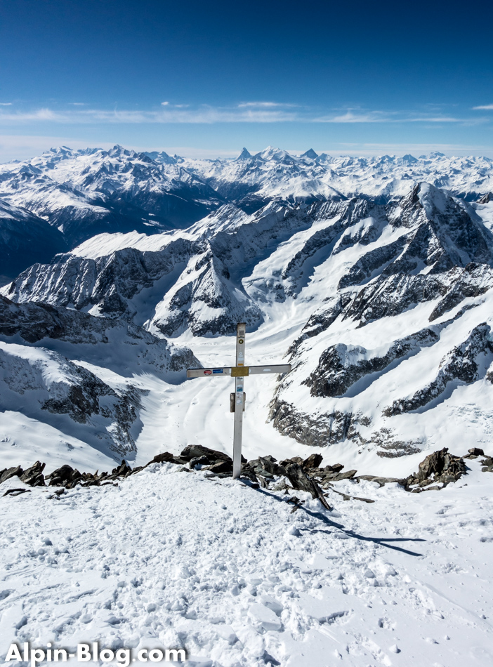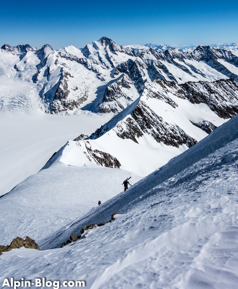 Bald erreichen wir das Ende des Grats und satteln erneut auf Ski um. Vor uns erhebt sich eine weiß-blaue Wand und wir wissen, was das bedeutet: Soweit es geht mit Ski und wieder auf Steigeisen umbauen. Dieses Mal mit Pickel, denn das Gelände ist wirklich steil. Teilweise geht es über Blankeis ca. 100hm hoch zum Vorgipfel des Aletschhorn, den wir erleichtert erreichen. Angeblich ist diese Wand NUR 40° steil, was ich rückblickend gar nicht glauben kann, denn sie kam uns viel steiler vor. Wahrscheinlich auch aufgrund der harten Bedingungen. Einen interessanten Beitrag dazu gibt es LINK hier. Dürfte also nicht nur uns so gehen… Wie dem auch sei; hinter dem Vorgipfel erhebt sich nach einem kleinen Becken der Hauptgipfel – frontal mit einer Eiswand, seitlich ein Felsgrat. Vorsicht am Becken – hier befinden sich Spalten! Über den Felsgrat steigen wir seilfrei hoch und erreichen nach 20min den Hauptgipfel mit genialer Rundumsicht auf die Riesen des Berner Oberlands: Mönch, Jungfrau, Finsteraarhorn, Fiescherhörner und wie sie alle heißen. Ein Wahnsinn!