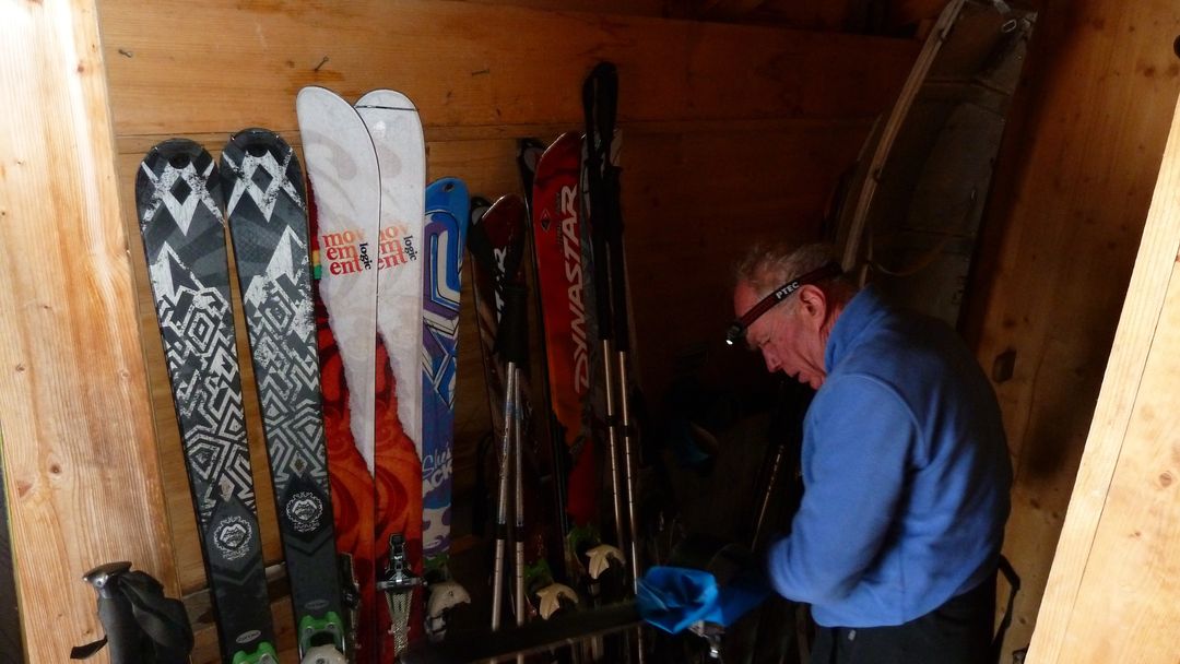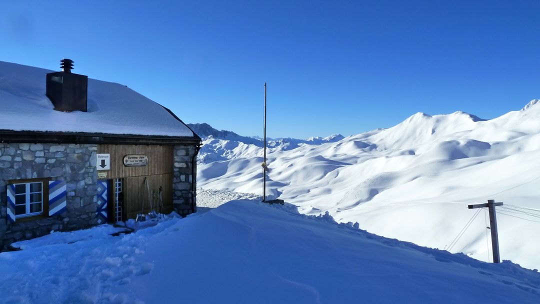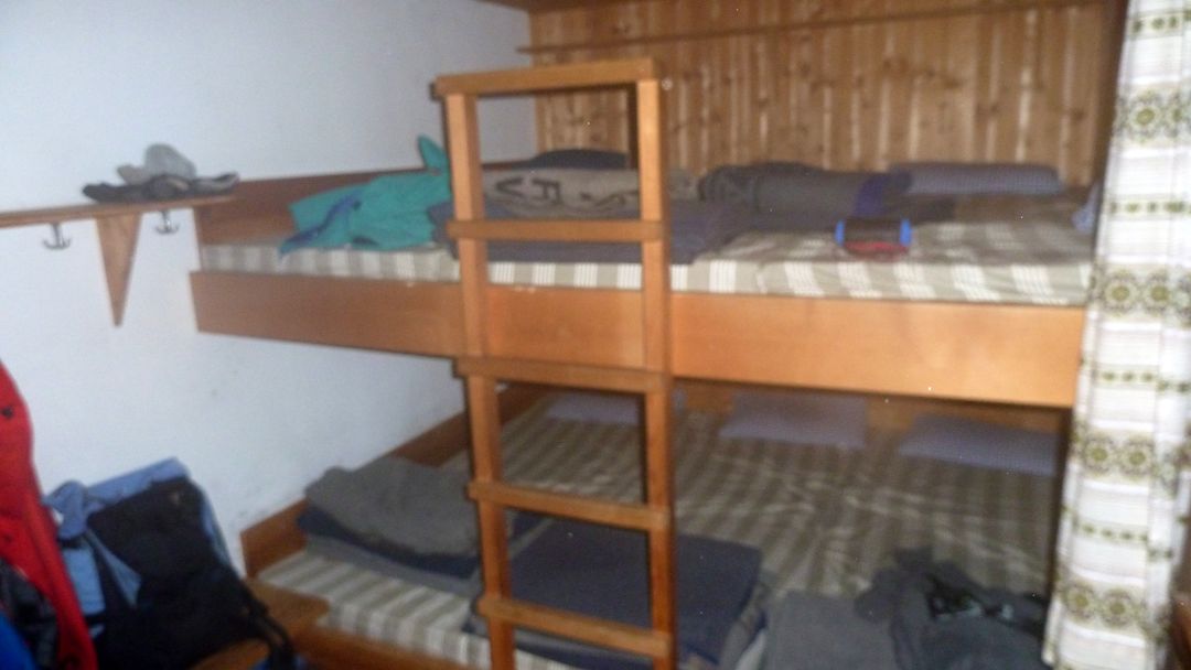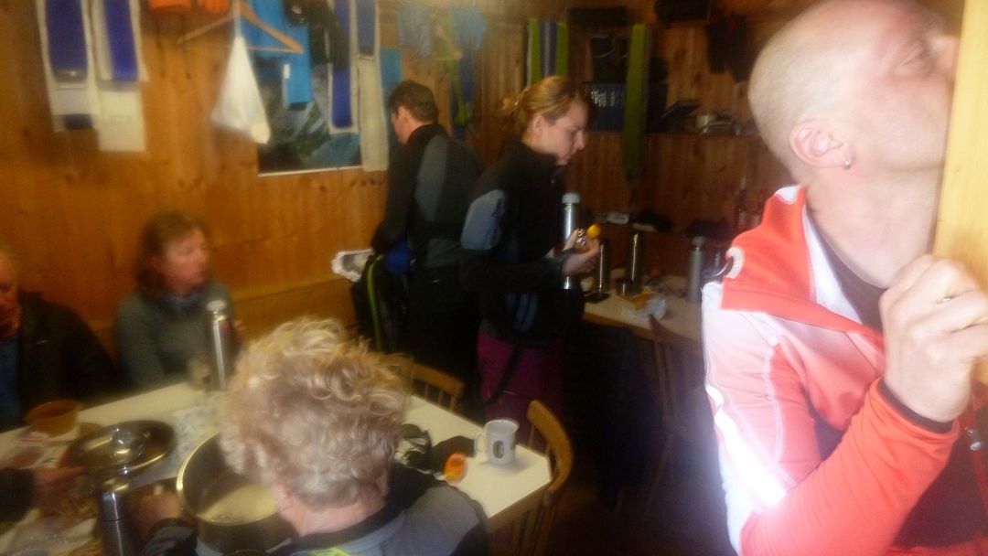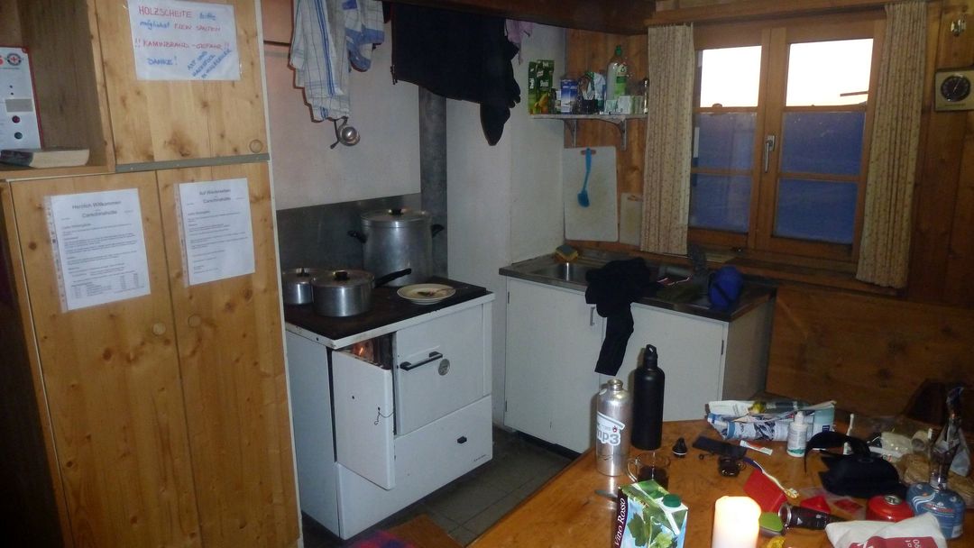 Durch den Vorraum (Ski etc.) erreicht man den gemütlichen Winterraum inkl. Ofen, allem Drum-und-Dran, Licht und 10 Lagerplätzen. Holz ist in Hülle und Fülle vorhanden, die Toilette befindet sich genauso wie eine funktionierende Wasserleitung außen. 2 Std. nach meiner Ankunft klopfen zwei Schweizer Splitboard-Fahrer an die Tür und freuen sich über den mittlerweile 10-Grad „warmen“ Raum. Zu Mitternacht stoßen drei junge Deutsche dazu und machen es sich im Schlaflager im 1. Stock bequem.