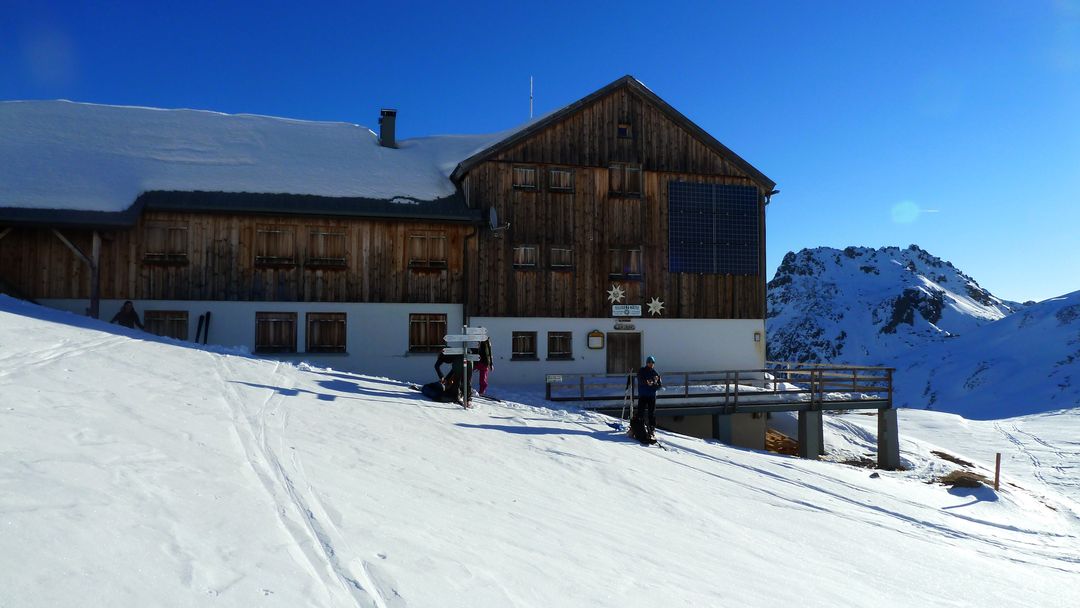 Da der Wind am Gipfel nicht unbedingt zum Verweilen einlädt geht’s zügig an die Abfahrt. Vorher bricht zur Sicherheit aber noch der Verschluss sowie das Unterrohr meines Dynafit SevenSummit Stocks. So ein Schmarrn! Mit 20cm verkürztem Stock ziehe ich meine Spur durch den „Rachen“ der gar nicht so böse ist – abgesehen davon, dass die Skibeläge an einer Stelle heftigen Felskontakt haben. Nach der Schlüsselstelle wird die Abfahrtsroute flacher und zum Abschluss nochmals kurz steil (unangenehme Wegführung im Winter). Am tiefsten Punkt angelangt heißt es wieder anfellen und durch den Wald zur Lindauer Hütte, auf deren Sonnenterrasse es sich angenehmst chillen lässt.
