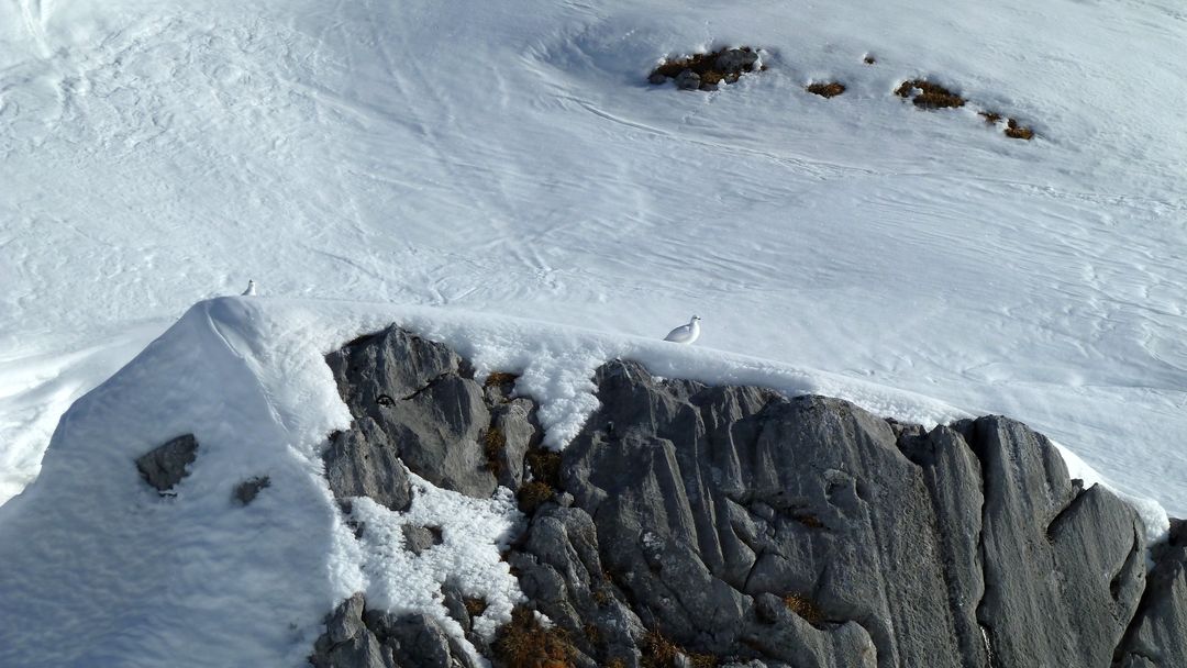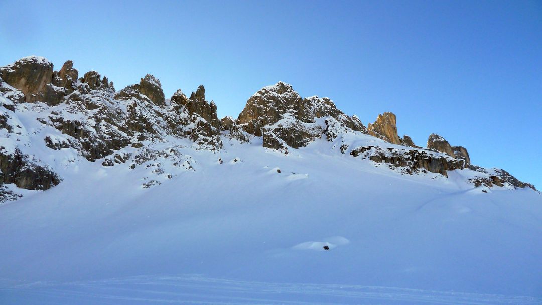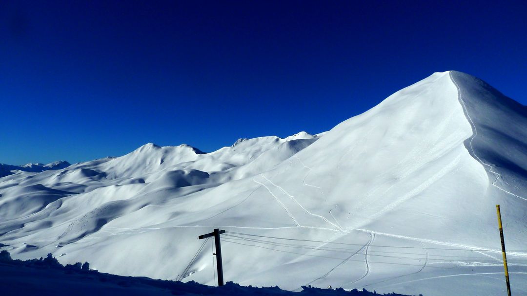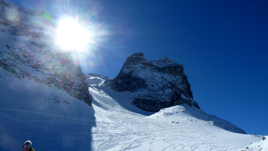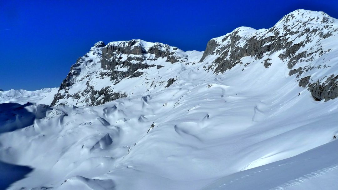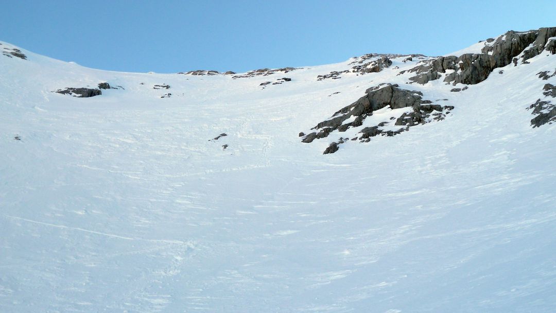 Sonntag: Der Wetterbericht liegt auch heute goldrichtig und die Sonne zeigt sich von der Früh weg! Die Entscheidung fällt nicht leicht – schlussendlich gewinnt der nahe Schafberg, der eine interessante Nordabfahrt bieten könnte. Gesagt getan, zuerst etwas Richtung Tal abfahren und schnell merke ich, dass dieser Sonnenhang keine guten Verhältnisse bietet. Also anfellen und rauf auf den Schafberg auf dessen Gipfel ich meine Schweizer Kollegen treffe. Nach kurzer Pause rutsche ich links des Grats ca. 15m ab und fahre in den Hang ein. WOW – was für ein Hang und was für perfekter Schnee! Damit hätte ich wirklich nicht gerechnet! Powder, Powder und bei durchschnittlich ca. 37 Grad Neigung. Die Bedingungen sind absolut sicher – der Hang bewegt sich keinen Millimeter und es sind keine frischen Spuren zu sehen.