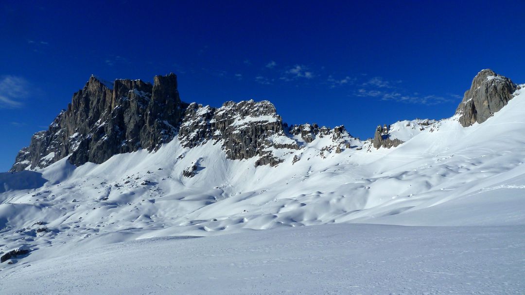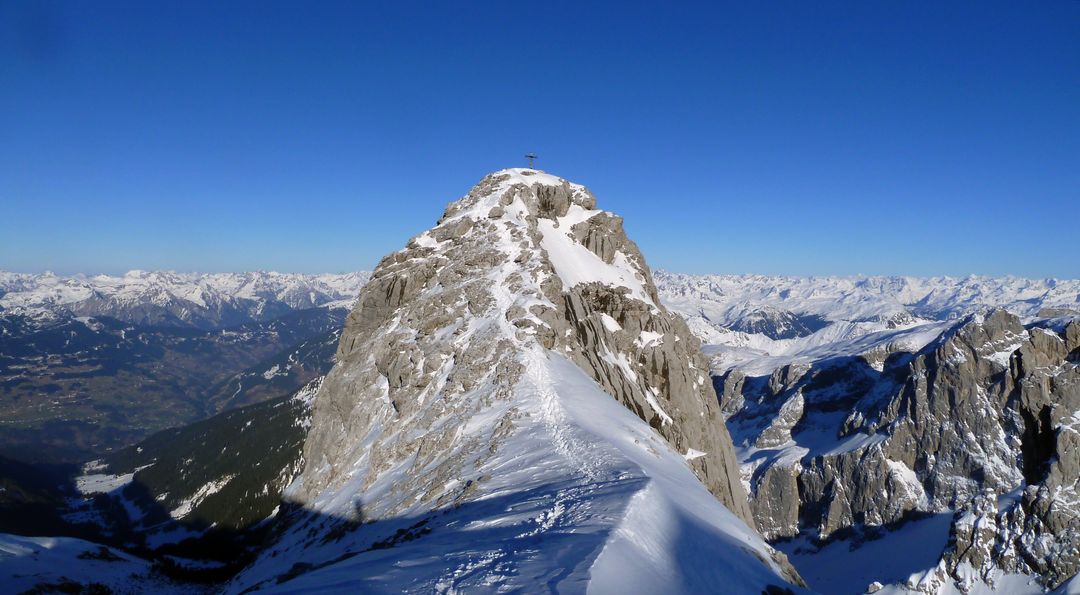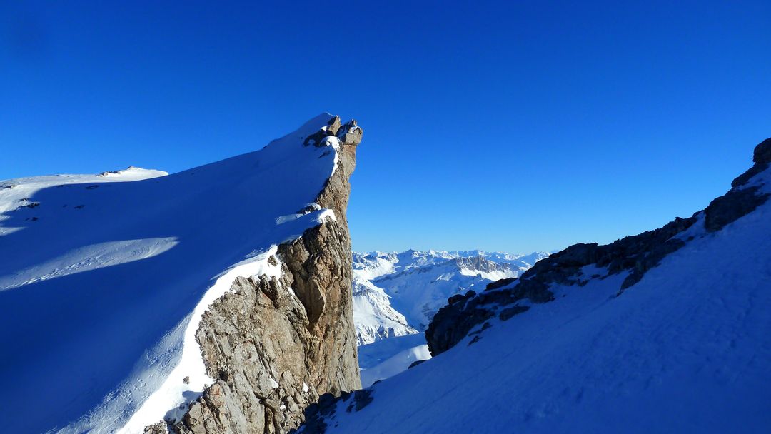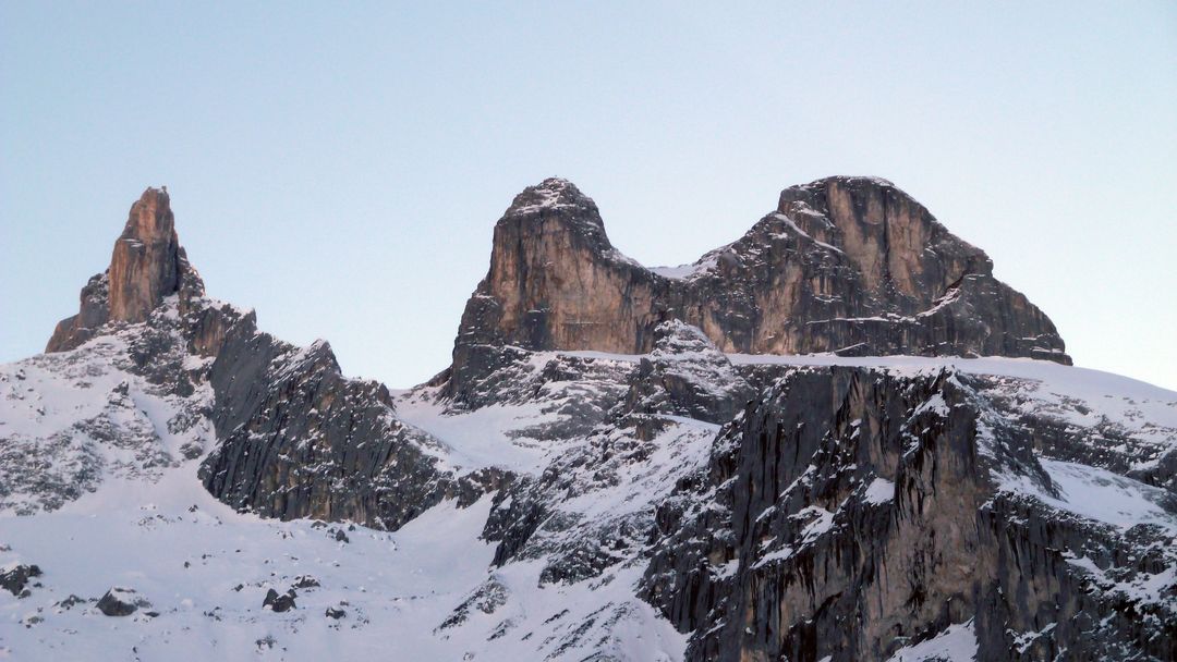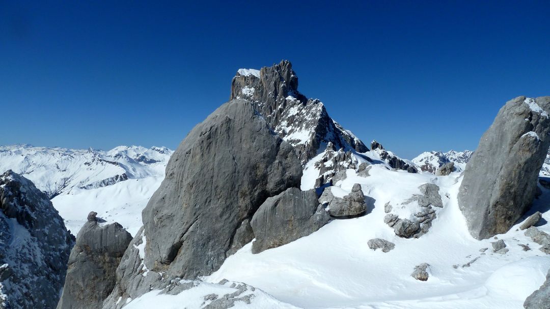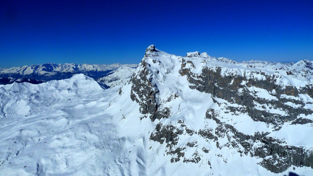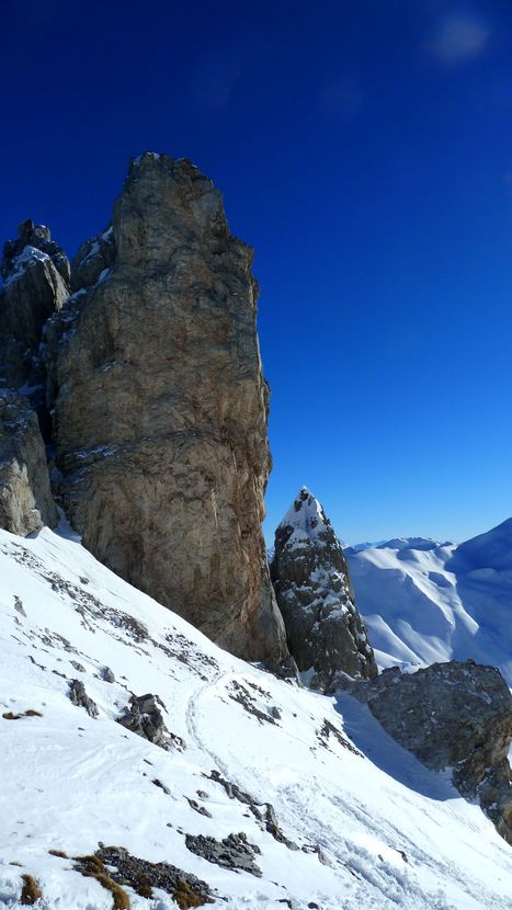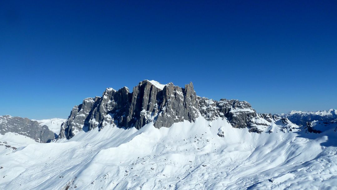Die nächsten 200 hm sind problemlos und steilen am Ende nochmals 50 hm auf ca. 40 Grad auf. Also Ski auf den Rücken und dieses Stück zu Fuß rauf. Danach öffnet sich eine Art Mulde, von der aus die drei Türme gut auszumachen sind. Pausiert wird – wie es sich gehört – am Großen Turm in der Sonne bei Windstille. Gegenüber sind Spuren auf die Drusenfluh auszumachen – sieht von hier aus SEHR anspruchsvoll aus, da absolutes Absturzgelände unterhalb des Gipfels.