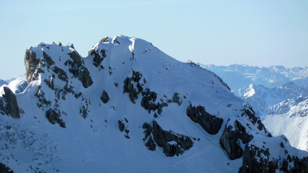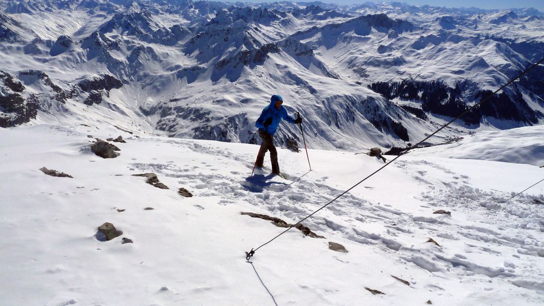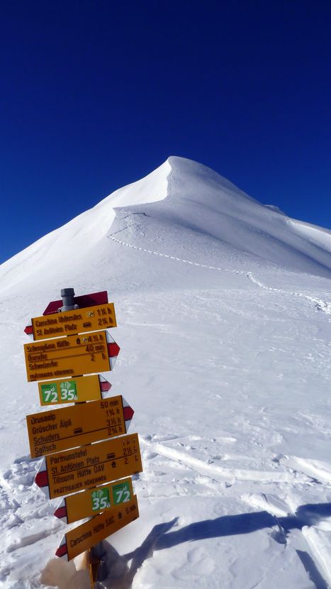 Samstag: Nach mittelprächtiger Nacht lacht uns heute die Sonne ins Gesicht. Das Frühstück ist schnell abgehakt und so geht es flott via Grubenpass auf die Weißplatte. Das 3. Viertel es Gipfelanstiegs beinhaltet eine 80hm Tragestelle – ansonsten ist der Weg problemlos machbar. Das Gipfelpanorama bietet perfekte Sicht auf die ringsum liegenden Berggrößen wie Schesaplana, Sulzfluh und Drei Türme. Schneebedingt wird rasch der Plan geschmiedet, in direkter Linie zurück zur Tilisunahütte zu fahren und von dort aus auf die Sulzfluh zu steigen. Gesagt getan, gute Abfahrtsbedingungen und leichter, dafür relativ langgezogener Aufstieg auf die Sulzfluh, auf der ich heute nicht als einziger stehe.