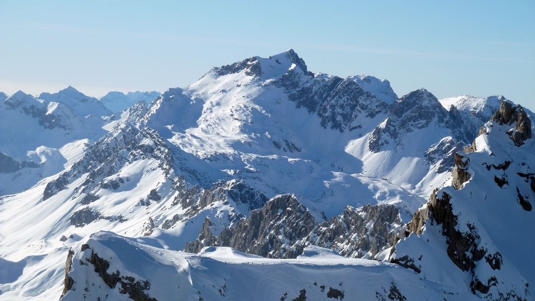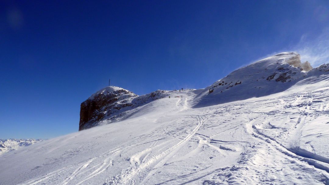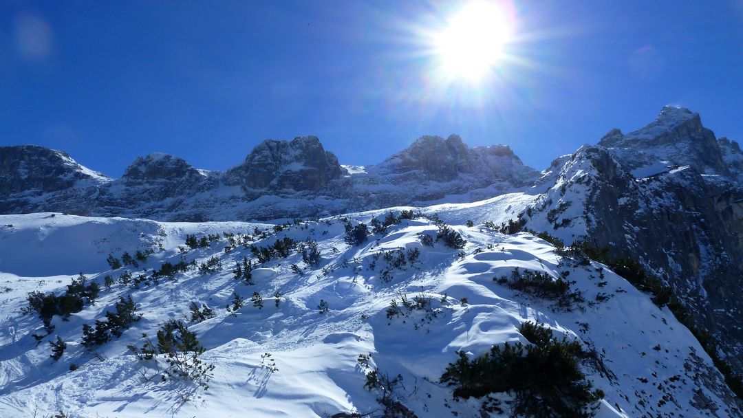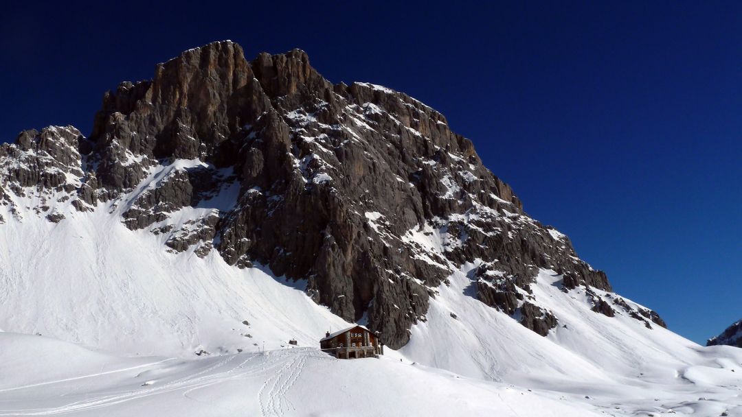 Nachdem es sich hier um die wohl genialsten 400 hm des bisherigen Winters handelt beschließe ich, mein Glück nochmal zu versuchen. Also unter der Sonne aufsteigen, an der Carschinahütte vorbei und dieses Mal direkt die Aufstiegsspur nutzend hoch zum Gipfel. Die 15-20 pausierenden Touren lasse ich rechts liegen, rutsche einige Meter zum kleinen Joch zwischen den beiden Gipfeln und spure 20 hm auf den anderen hoch. Die Abfahrt ab hier ist ebenfalls wieder vom Feinsten und ich genieße jeden Schwung im trockenen Pulver!