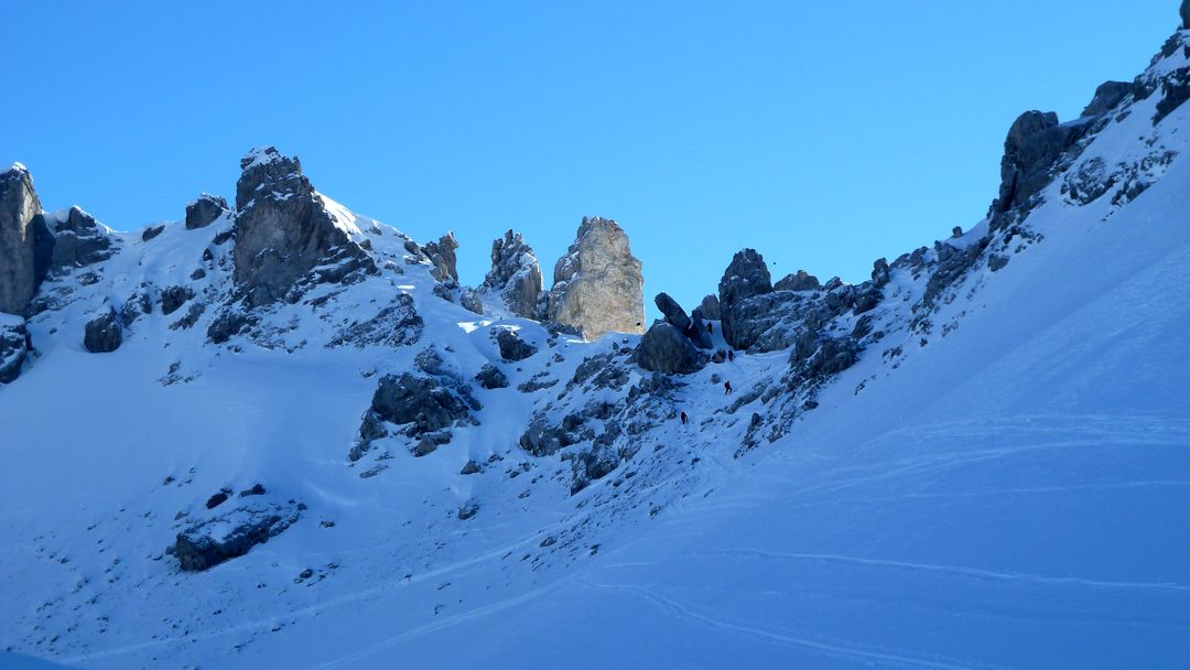 Auf Höhe der Lindauerhütte ist die Abfahrt zu Ende. Nachdem die Uhr erst 13:30 zeigt beschließe ich den Aufstieg zu den Drei Türmen – mal sehen wie weit ich komme. Der Weg führt im Schatten hoch zu einem Durchgang, wobei die letzten Meter SEHR knackig sind (so wenig Schnee im steilen Wandteil, dass man tief einbrechen kann. Außerdem sehr eisig). Obwohl es sich nur um wenige Meter handelt ist das eine echte „Zitterpartie“ und ich bin froh, diese Stelle heil geschafft zu haben.