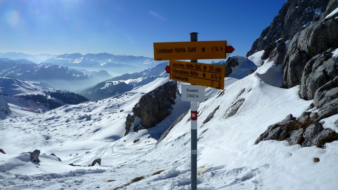 Die Entscheidung Totalalphütte (samt Schesaplana am nächsten Tag) vs. Carschinahütte wird mit von der Hüttenwirtstochter abgenommen, denn derzeit gibt es auf der Totalphütte keinen Strom und ohne den geht nichts (kein Holzofen). Ist mir so eigentlich eh auch lieber. Also das kurze Stück durch den Wald und hoch zum Drusentor, wobei die letzten Meter ohne Ski zu stapfen sind. Nachdem das Tor Nord-Süd ausgerichtet ist strahlt auf der anderen Seite wieder die Sonne und die Ärmel werden hochgekrempelt :-). Felle runter, sehr links haltend abfahren, ein kurzer Gegenanstieg und schon erreicht man die Carschinahütte.