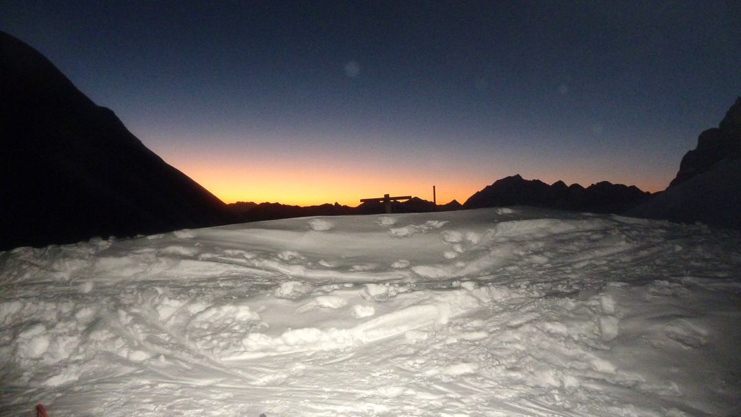 Nach 20 Min erreiche ich die spärlich beleuchtet Tilisunahütte und staune nicht schlecht, dass bereits 15 weitere Personen (französische 6er Gruppe, deutsche 9er Gruppe) hier sind. Der Winterraum bietet 16 Personen Platz – d.h. wir sind hart an der Grenze und müssen zusammen rücken – dafür ist es schön warm ;-) Der Winterraum ist gut ausgestattet im 1. Stock inkl. Indoor-WC, 2 Schlafräumen und einem Koch-/Aufenthaltsraum.