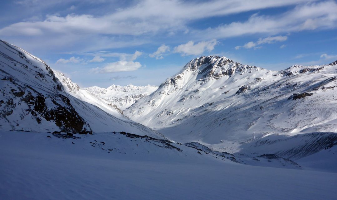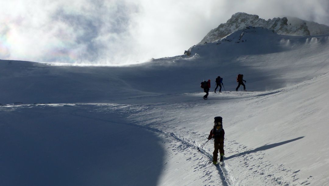 Sonntagmorgen starten wir um 09:45, die Sicht ist besser wie erwartet und wir spuren hoch zum Beginn des Silvrettagletschers. Auf der linken Seite stapfen wir dann die rote Furka in der Rinne hoch und erkennen erst oben, dass wir ein Stück weiter rechts eine leichtere Alternative ohne Stapfen gehabt hätten. Nachher ist man halt immer schlauer… Die Abfahrt auf der anderen Seite ist technisch einfach hat aber extrem wenig Schnee und so fahren wir öfter auf Felsen auf. Wir tasten uns bis auf Höhe der Klostertalerhütte, halten uns wieder links und spuren hoch zum Litznersattel. Eine einsame, ildromantische und gleichzeitig eindrucksvolle Alpinumgebung erwartet uns hier – gepaart mit frischem Pulver.