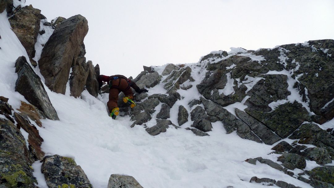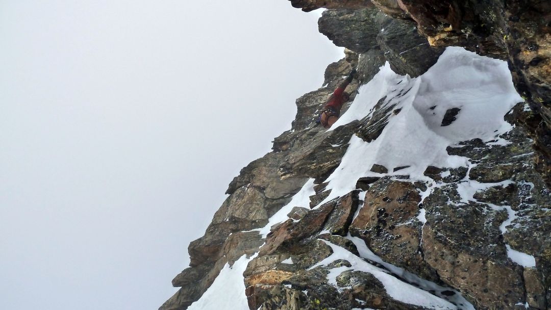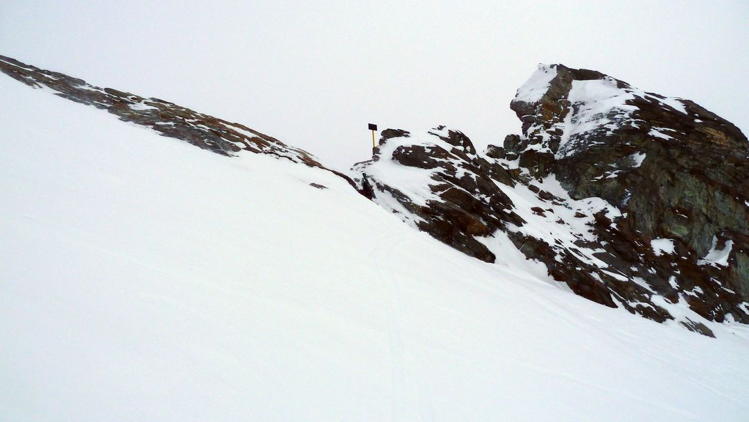 Samstagmorgen starten wir gemütlich gegen 09:00 mit vollen Rucksäcken von der Hütte. Zuerst queren wir auf Hüttenhöhe Richtung Grüne Kuppe, auf die wir hochspuren, auf der anderen Seite abrutschen, unter dem Bruch des Ochsentaler Ferners vorbei marschieren und diesen dann rechts außen hoch spuren. Kurz vorm Gletscherplateau teilt sich unsere Gruppe: 3 Personen lassen das Wochenende gut sein und fahren ab – Harald und ich entscheiden uns mit noch schwereren Rucksäcken für den Weiterweg. Den Gletscher nehmen wir angeseilt auf direkter Spur bis hoch zum Skidepot, wo uns 2 Seilschaften von der Hütte im Abstieg begegnen. Wir steigen mit Pickel und Steigeisen über das relativ harte Schneefeld zum Beginn der Kletterschwierigkeiten auf. Die unteren beiden Kletterstellen gehen gut, die obere ist ein wenig eine Zitterpartie. Seil wäre hier nicht schlecht gewesen – haben wir nach Auskunft der anderen Seilschaften aber beim Rucksack gelassen. Es geht schon ohne auch, aber ausrutschen darf man hier keinesfalls!